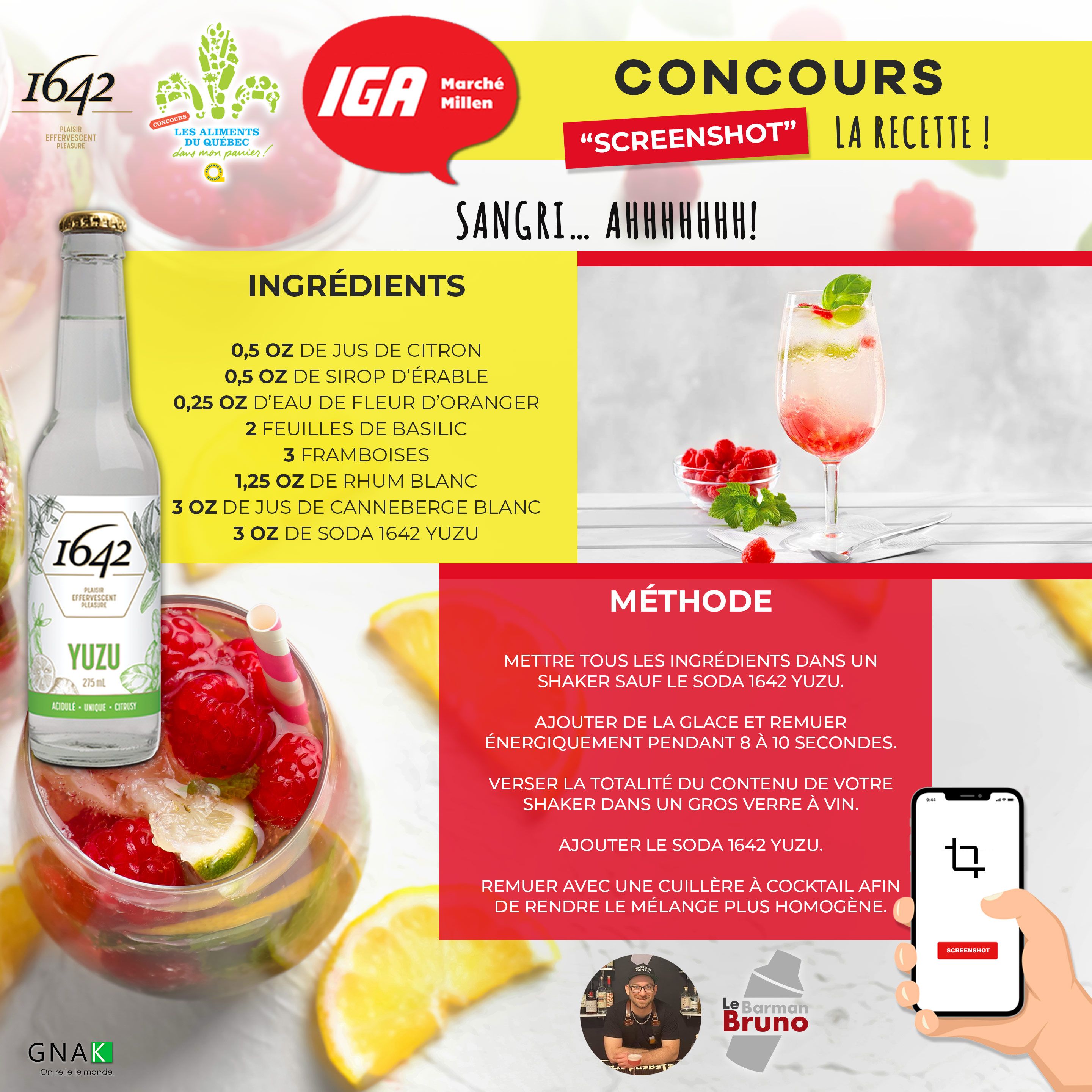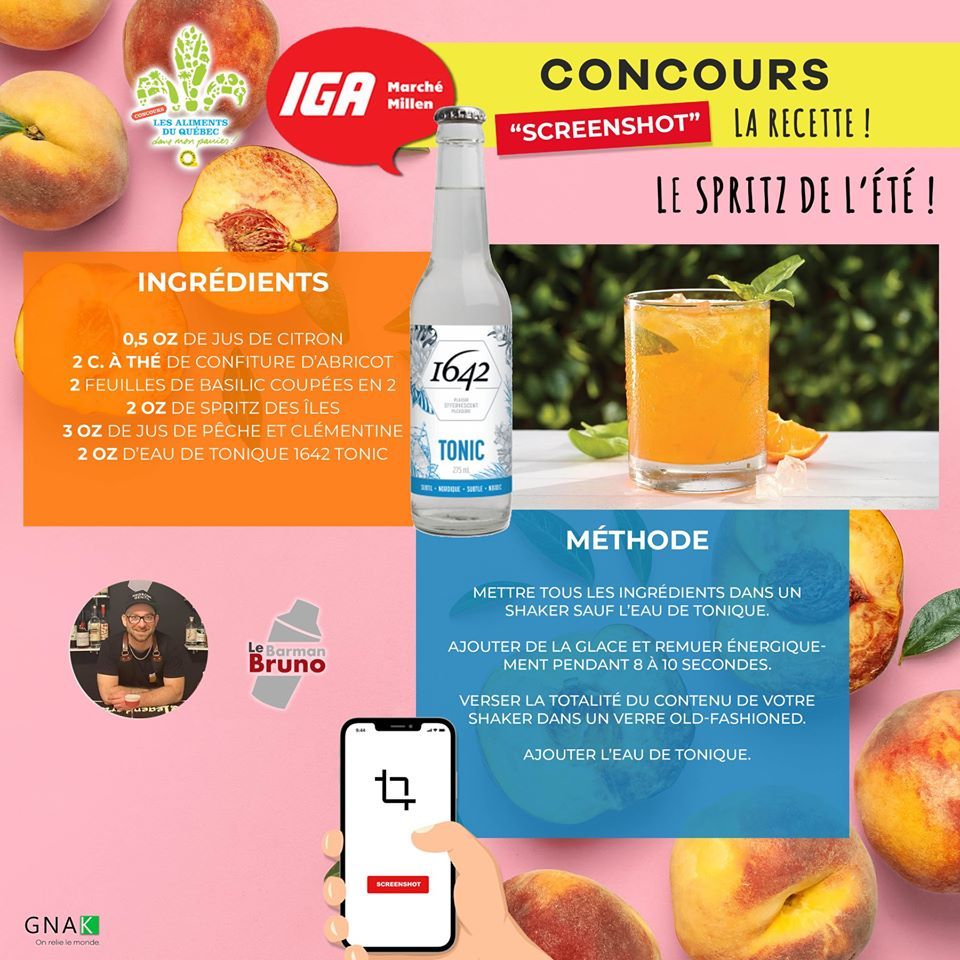 Du 17 août au 13 septembre, participe au CONCOURS SCREENSHOT LA RECETTE pour courir la chance de gagner 2 ensembles cadeaux d'accessoires en mixologie avec les produits 1642 et des produits du terroir d'une valeur de 100$.