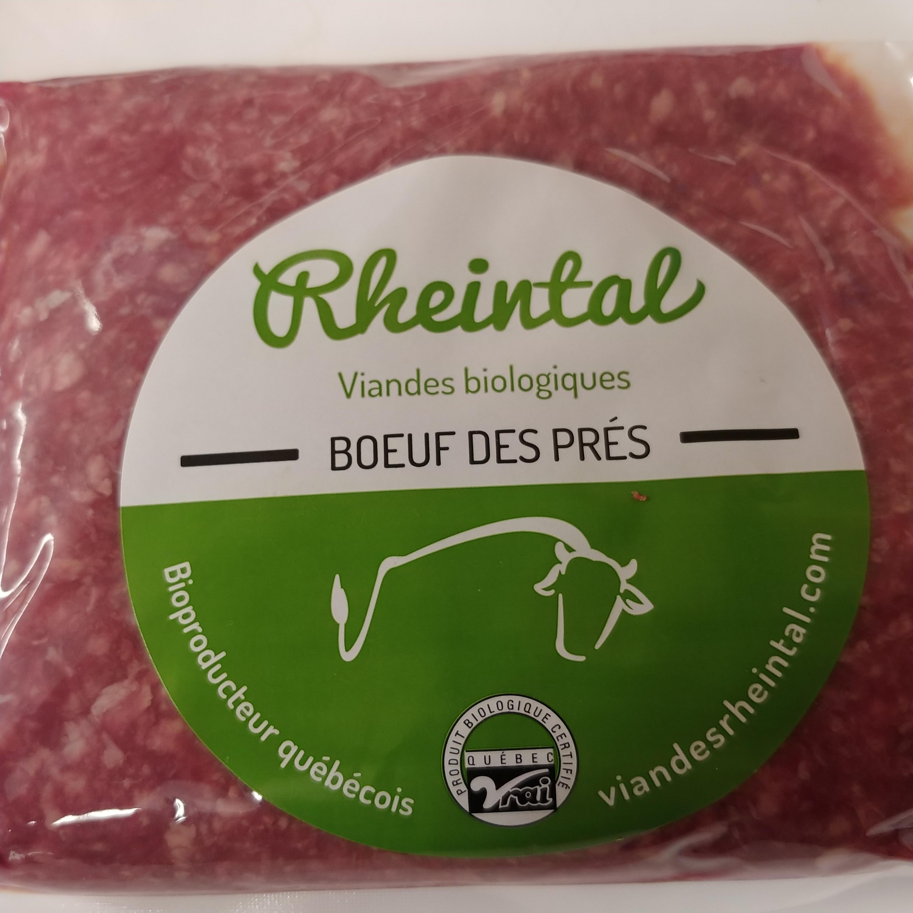 Rheintal collabore avec plus de huit bio producteurs certifiés biologiques du Québec. Tous travaillent avec le même cahier de charges biologiques et le même savoir-faire. La majorité des races bios élevées est composée d'un mélange hybride entre trois espèces bovines. Les femelles reproductrices sont un mélange Hereford- Simmental, ce qui leur confère une excellente qualité maternelle. Le mâle reproducteur est un pur sang Angus. Ce croisement de races donne une viande mi- maigre avec un beau persillage et une bonne tendreté. Brièvement, ce mélange génétique permet d'optimiser les qualités de ces trois races bovines soit : rendement carcasse, saveur et ce, dans le but d'obtenir une viande délicieuse pour tous les fins palais.